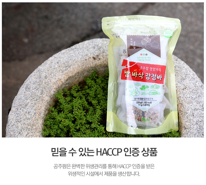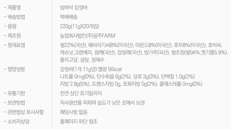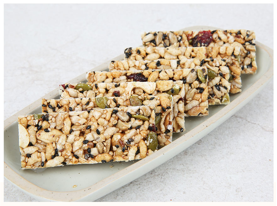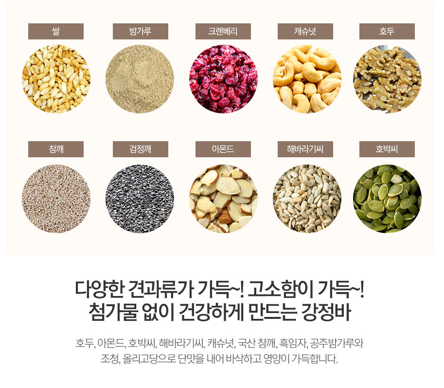 우리쌀, 해바라기seed, 아몬드, 호두, 호박seed, 캐슈넛, 크린베리, 참깨, 검정깨, 밤가루, 쌀조청을 넣어 만든 영양가득 강정바는 남녀 노소, 아이 모두가 즐길
