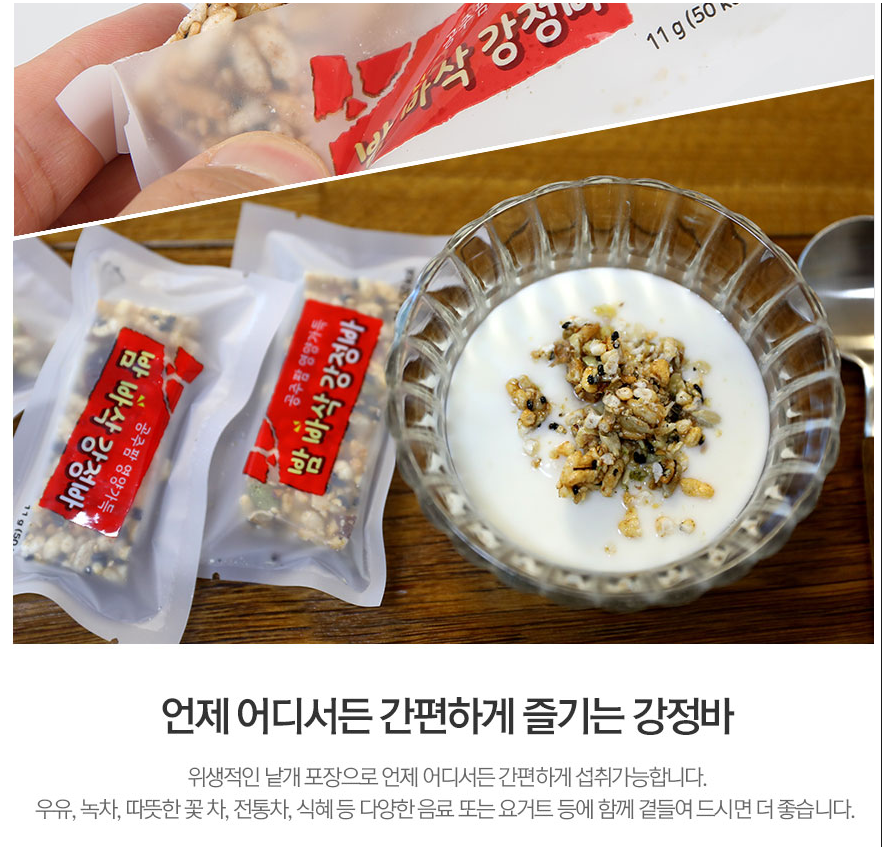 요거트와 곁들여 드시면 더 아삭한 식감으로 강정바를 즐기기에 좋습니다.